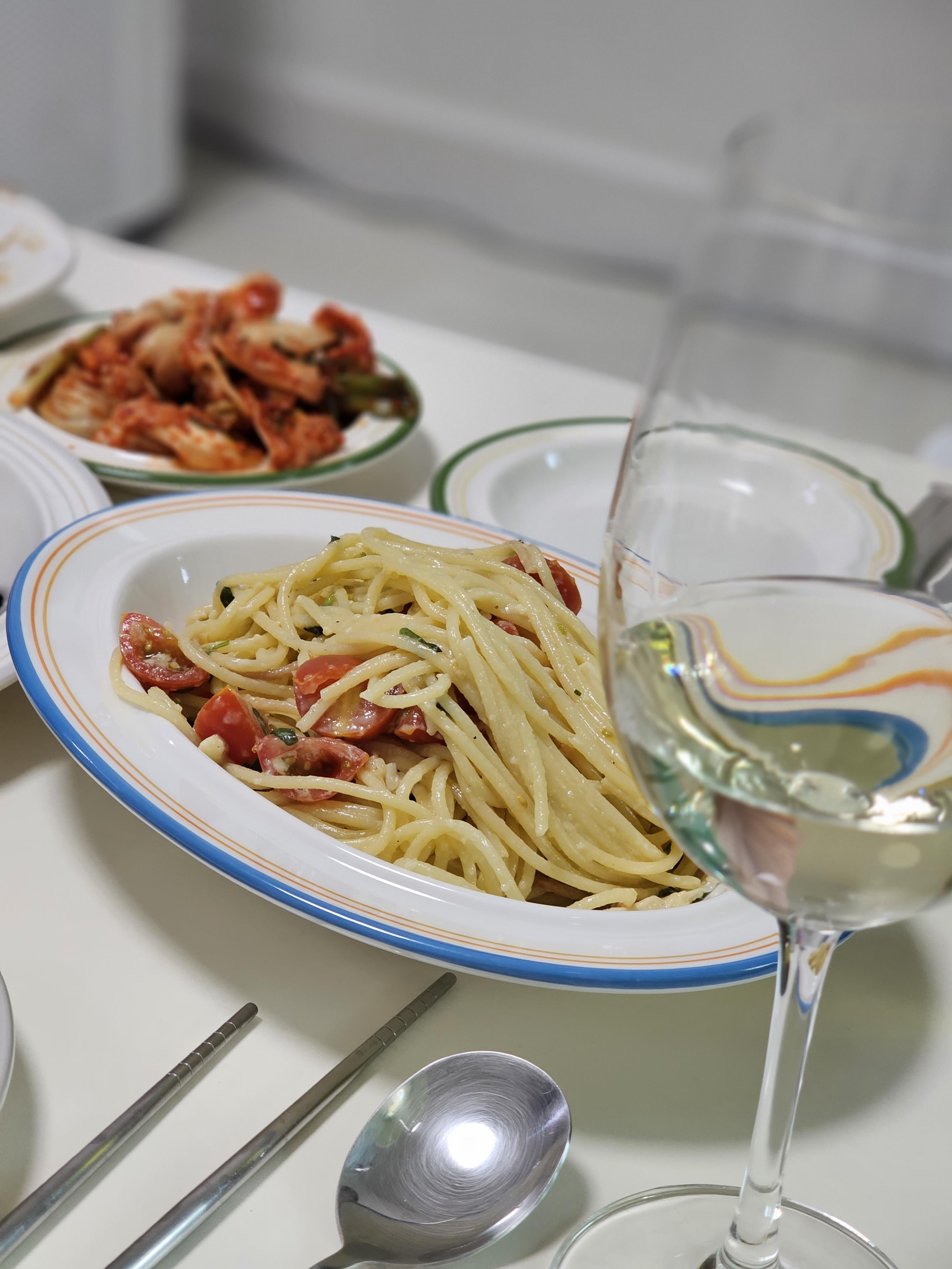 브리치즈를 이용한 냉파스타인데, 요게 진짜 화이트와인과 너무나 찰떡 궁합이어서 마음에 쏙 들었네요.